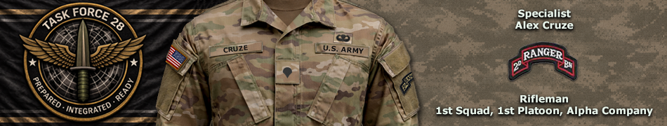 THIS IS TO CERTIFY THAT THE SECRETARY OF THE ARMY HAS REPOSED SPECIAL TRUST AND CONFIDENCE IN THE PATRIOTISM, VALOR, FIDELITY AND PROFESSIONAL EXCELLENCE OF Alex CruzeIN VIEW OF THESE QUALITIES AND THEIR DEMONSTRATED LEADERSHIP POTENTIAL AND DEDICATED SERVICE TO THE UNITED STATES ARMY AND TASK FORCE 28, THEY ARE THEREFOR ADVANCED TO THE RANK OF PFC |